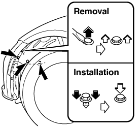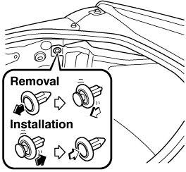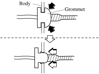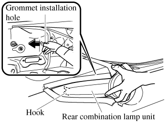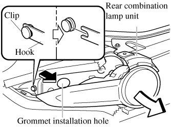 To provide a hole for inserting a finger to remove the rear combination lamp unit later in the procedure, pinch the top and bottom of the grommet shown in the figure and press it out of the hole in the direction of the rear combination lamp unit.