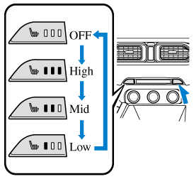 Press the seat ventilation switch while the ignition is switched ON to operate the seat ventilation. The indicator lights turn on to indicate that the seat ventilation is operating. The mode changes as follows each time the seat ventilation switch is pressed.