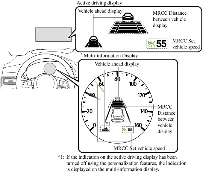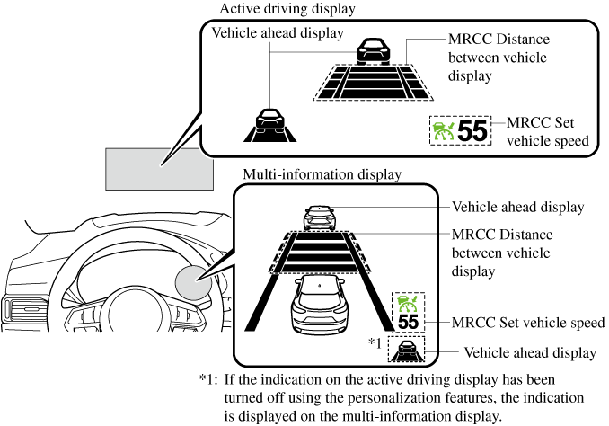 The MRCC with Stop & Go function setting status and operation conditions are indicated on the multi-information display and the active driving display.