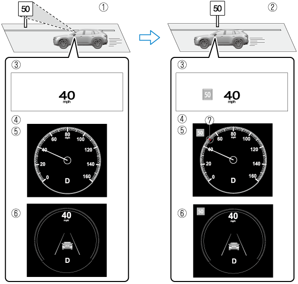 If the vehicle speed exceeds the speed limit sign indicated in the active driving display/instrument cluster while the vehicle is driven, the system notifies the driver using the indication in the active driving display/instrument cluster and a warning sound.