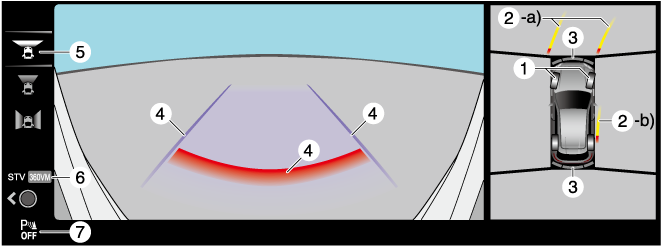 Indicates the approximate projected path of the vehicle. Moves in conjunction with the steering wheel operation. a) Indicates the path where the rear end of the rear bumper passes as a reference. b) Indicates the path where the outer side of the vehicle is expected to travel. |
