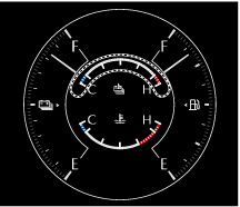 Displays the high voltage battery temperature. The blue range of the gauge indicates that the high voltage battery temperature is low and the red range indicates that it is high and overheating.