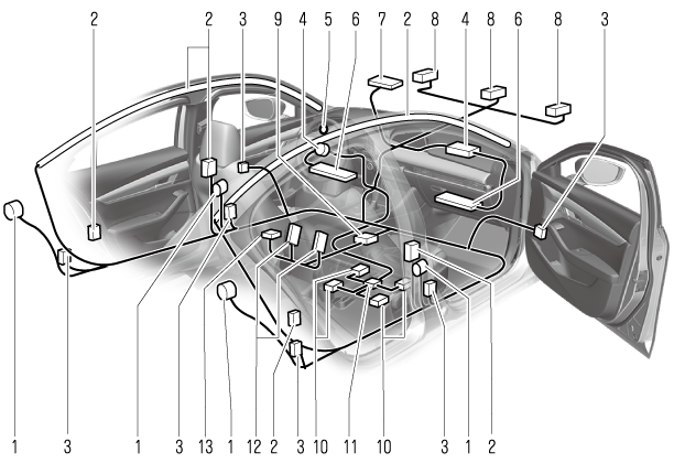 9. Roll-over sensor, crash sensors, and diagnostic module (SAS unit)