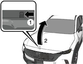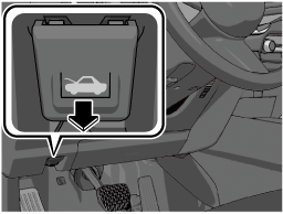 Insert your hand into the hood opening, slide the latch lever in the direction of the arrow as shown in the illustration, and lift up the hood.