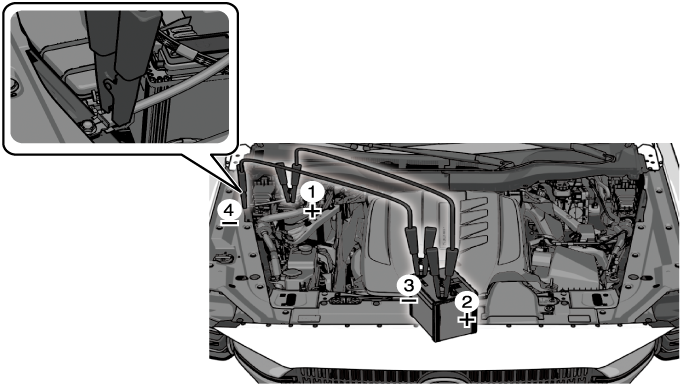 Using commercially available booster cables, connect the lead-acid battery of the booster vehicle’s battery to the lead-acid battery of your vehicle and start the hybrid system.