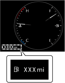 La distance maximale de conduite est calculée et affichée en fonction du niveau du réservoir de carburant restant et de la consommation de carburant. Lorsque la distance maximale de conduite est de 50 km (30 miles) ou plus, l'indication de distance maximale de conduite diminue par incréments de 10 km (10 miles), et lorsque la distance maximale de conduite est de 50 km (30 miles) ou moins, elle diminue par incréments de 1 km (1 mile).