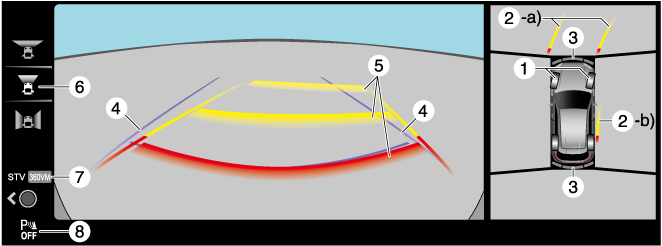 Lignes de guidage de distance sur la trajectoire anticipée du véhicule (rouges/jaunes) |