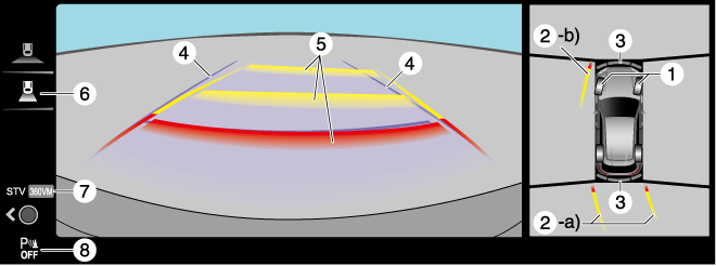 Indique la trajectoire calculée approximative du véhicule. Tournent conjointement avec les mouvements du volant. a) Indique la trajectoire que devrait suivre l’extrémité arrière du pare-chocs arrière à titre de référence. b) Indique la trajectoire que devrait suivre le côté extérieur du véhicule. |