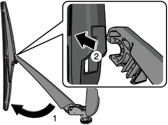 Faire glisser le balai dans le sens indiqué par la flèche tout en appuyant sur la languette du bras de l'essuie-glace pour retirer le balai.