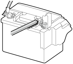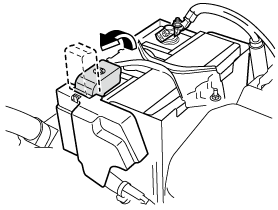 Keep flames and sparks away from lead-acid battery cells and do not allow metal tools to contact the positive (+) or negative (-) terminal of the lead-acid battery when working near a lead-acid battery. Do not allow the positive (+) terminal to contact the vehicle body.