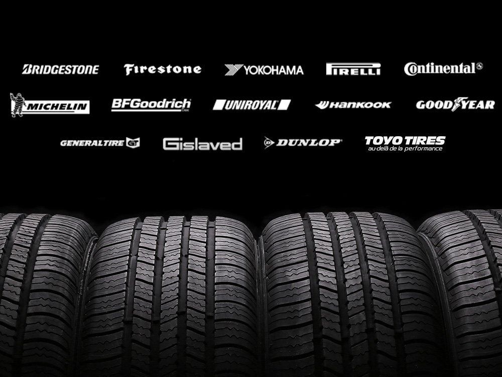 †Comprend des pneus de BFGoodrichMD, BridgestoneMD, ContinentalMD, CooperMD, DunlopMD, FirestoneMD, GeneralMD, GislavedMD, GoodyearMD, HankookMD, KellyMD, MichelinMD, PirelliMD, ToyoMD, UniroyalMD et YokohamaMD.