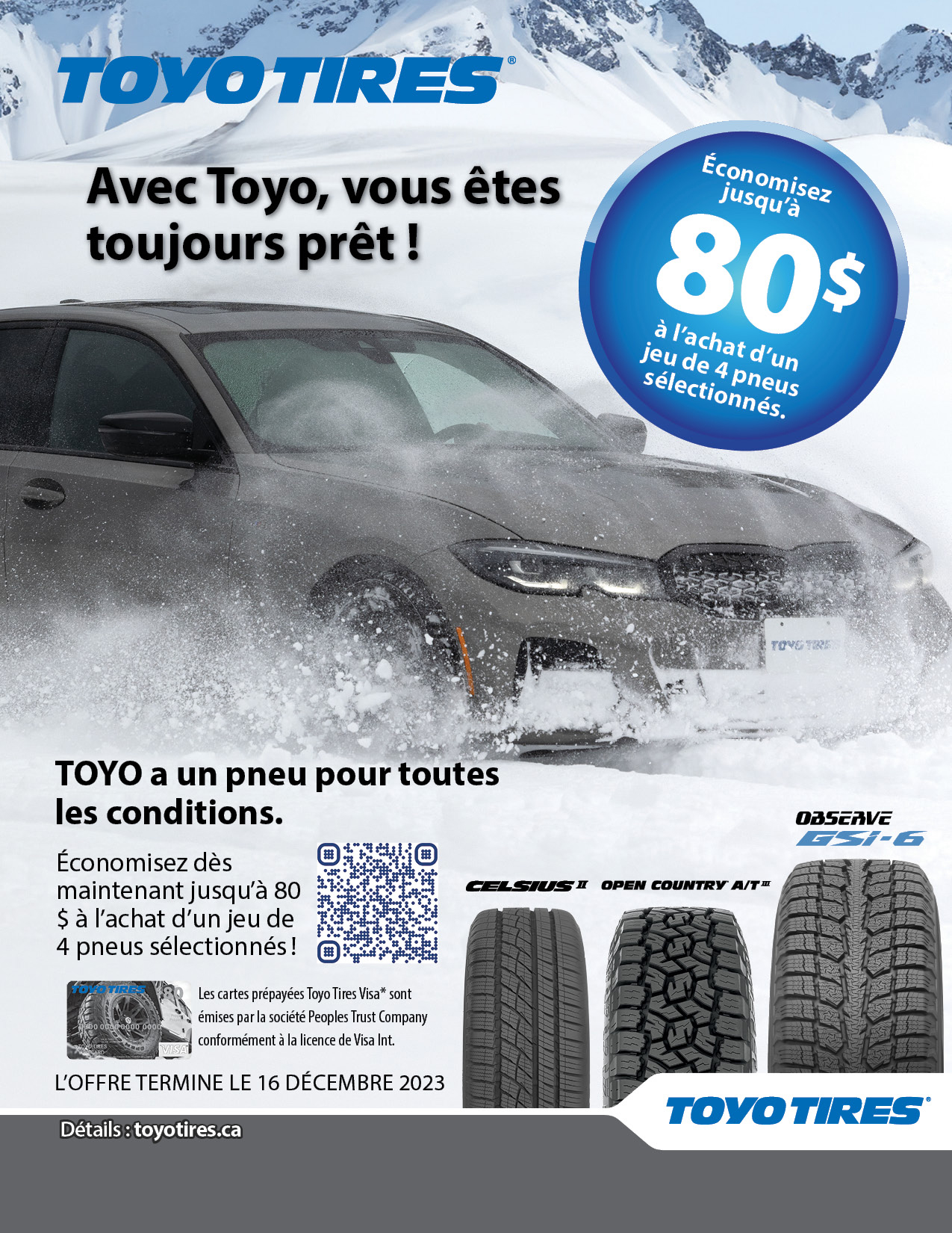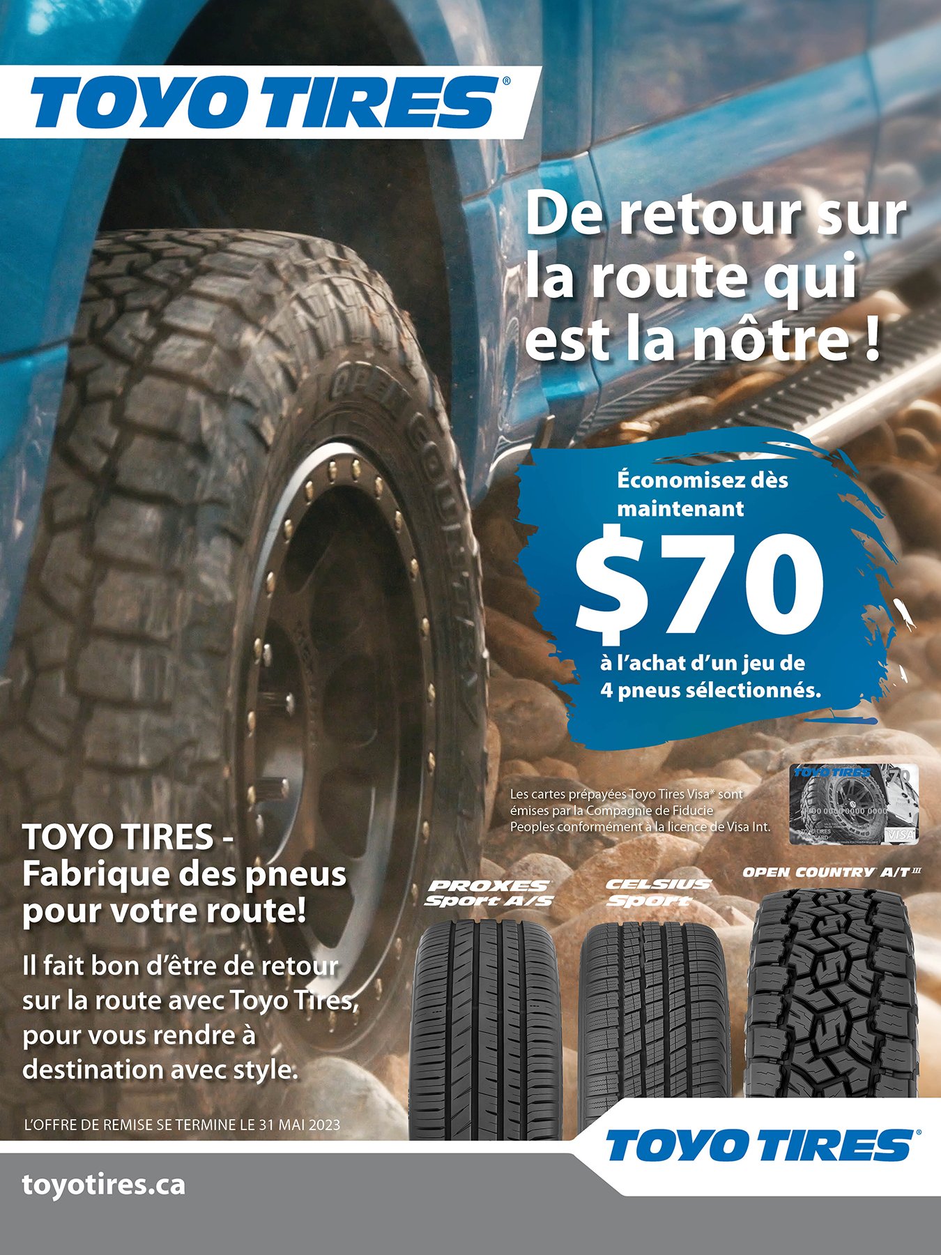 Toyo TiresAchetez un ensemble de quatre pneus Toyo et recevez un rabais jusqu’à 30 $*. |