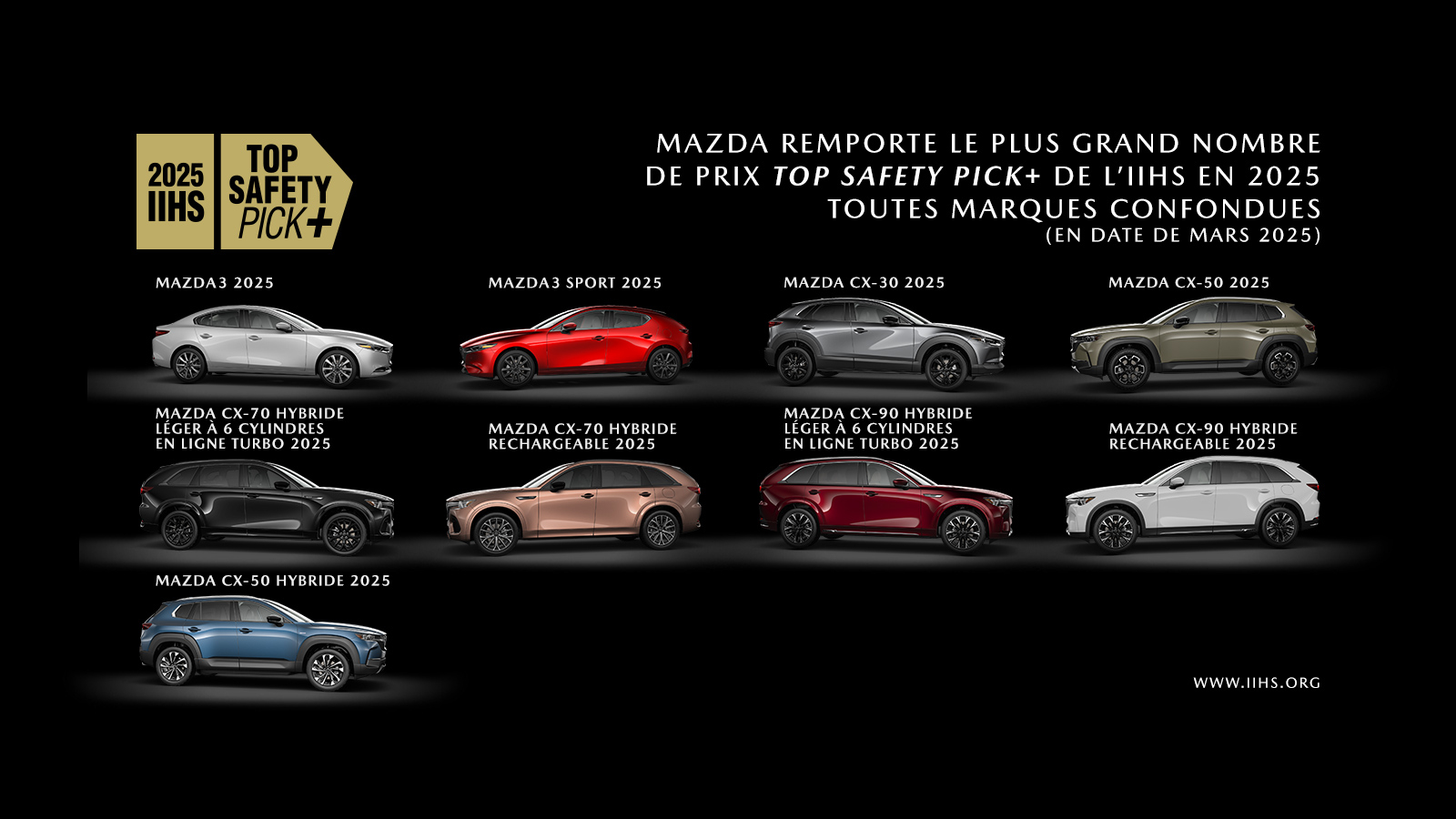 RICHMOND HILL, ON (13 mars 2025) – L’Insurance Institute for Highway Safety (IIHS) a annoncé les lauréats de ses prix MEILLEUR CHOIX SÉCURITÉ et MEILLEUR CHOIX SÉCURITÉ+ de 2025 et Mazda est fière d’avoir reçu huit prix MEILLEUR CHOIX SÉCURITÉ+, plus que toutes les autres marques. Il s’agit de la plus haute distinction en matière de sécurité automobile. Les véhicules primés comprennent le Mazda3, le Mazda3 Sport, le CX-30 et le CX-50, y compris les modèles CX-50 hybride, CX-70, CX-70 hybride rechargeable (PHEV), CX-90 et CX-90 PHEV de l’année modèle 2025.