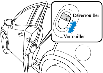 Si le verrou de sécurité est poussé en position verrouillée avant de fermer la portière, elle ne peut pas être ouverte de l'intérieur. Pour ouvrir la portière il faut tirer uniquement sur la poignée extérieure.