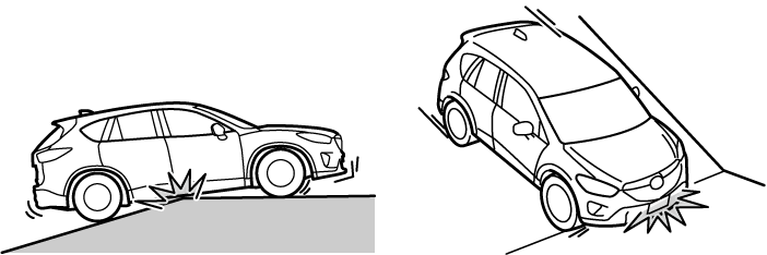 La suspension et le dessous de la carrosserie du véhicule peuvent être endommagés en cas de conduite sur des routes accidentées/irrégulières ou sur des dos d'âne à grande vitesse. Faire preuve de prudence et réduire la vitesse lors de la conduite sur des routes accidentées/irrégulières ou sur des dos d'âne.