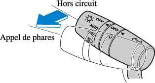 Pour faire un appel de phares, tirer le levier à fond vers soi (l'interrupteur des phares n'a pas besoin d'être sur la position de marche). Le témoin des feux de route de phare s'allume simultanément sur le tableau de bord. Le levier reviendra automatiquement à la position normale lorsqu'il est relâché.