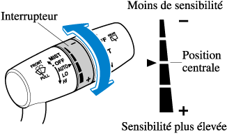 La sensibilité du capteur de pluie peut être réglée en tournant l'interrupteur sur le levier d'essuie-glace.