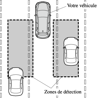 La zone de détection sur ce système couvre les voies de circulation des deux côtés du véhicule et depuis la partie arrière des portières avant à environ 50 m (164 pieds) derrière le véhicule.