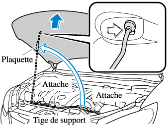 Saisir la tige de support à l'endroit du caoutchouc et l'engager dans le trou de la tige de support indiqué par la flèche pour maintenir le capot ouvert.