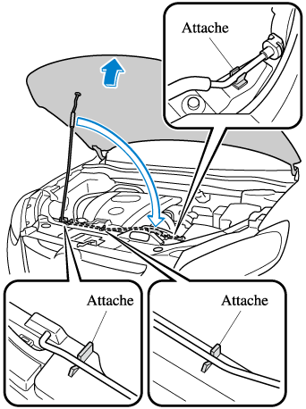 Soulever le capot, saisir l'endroit du caoutchouc sur la tige de support et le fixer la tige de support dans l'attache. Vérifier que la tige de support est fixée dans l'attache avant de fermer le capot.