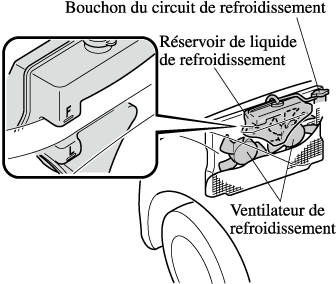 Si le ventilateur de refroidissement ne fonctionne pas lorsque le moteur tourne, la température du moteur augmentera. Arrêter le moteur et faire appel à un concessionnaire agréé Mazda.