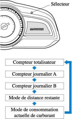 Le mode d'affichage peut être changé entre l'affichage du compteur journalier A et l'affichage du compteur journalier B en appuyant sur le sélecteur pendant que l'un d'eux est affiché. Le mode sélectionné sera affiché.