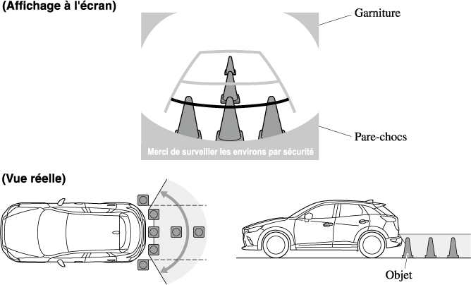 Le champ de vision est limité. Les objets sous le pare-chocs ou près des extrémités du pare-chocs peuvent ne pas être affichés.