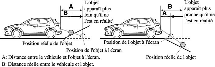 Lorsqu'il y a une pente raide montante (ou descendante) derrière le véhicule, l'objet affiché à l'écran apparaît plus loin (ou plus près en cas de pente descendante) qu'il ne l'est en réalité.