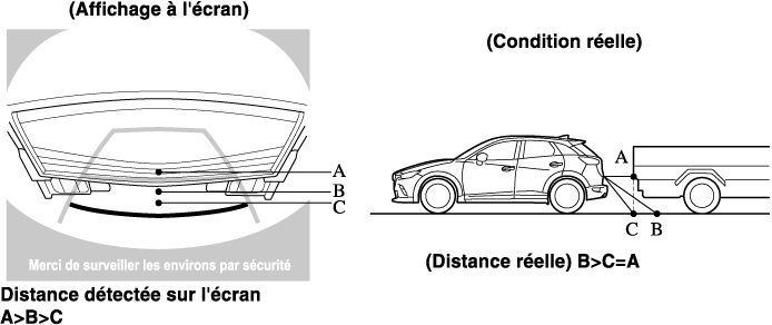 Lorsque l'arrière du véhicule est abaissé, l'objet affiché à l'écran apparaît plus loin qu'il ne l'est en réalité.