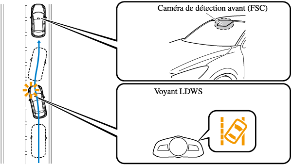 Le système détecte les lignes blanches ou jaunes sur la voie de circulation à l'aide de la caméra de détection avant (FSC) et, s'il détermine que le véhicule risque de quitter sa voie, il en informe le conducteur en utilisant l'affichage de conduite active (véhicules avec l'affichage de conduite active), et par le clignotement du voyant LDWS et l'activation de l'avertisseur sonore LDWS.