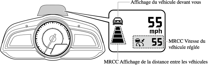 L'état des paramètres et les conditions de fonctionnement du système de Commande de croisière radar Mazda (MRCC) sont indiqués sur l'affichage de conduite active.