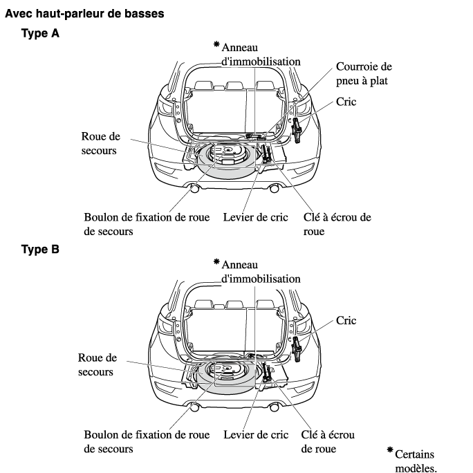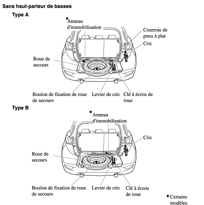 La roue de secours et les outils sont rangés aux endroits indiqués sur l'illustration.