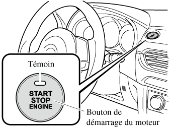 Si le voyant KEY (rouge) s'allume ou si le témoin du bouton de démarrage du moteur (ambre) clignote, cela peut indiquer un problème dans le système de démarrage du moteur lors de l'utilisation habituelle du démarrage (pour les véhicules équipés d'un tableau de bord de type A (Rechercher), les messages s'affichent sur le tableau de bord). Faire inspecter le véhicule par un concessionnaire agréé Mazda dès que possible. Le moteur peut alors être démarré de force. Maintenir le bouton de démarrage du moteur jusqu'au démarrage du moteur. D'autres procédures de démarrage du moteur, telles que la présence de la clé dans la cabine et l'activation de la pédale d'embrayage (boîte de vitesses manuelle) ou la pédale de frein (boîte de vitesses automatique), doivent être respectées.