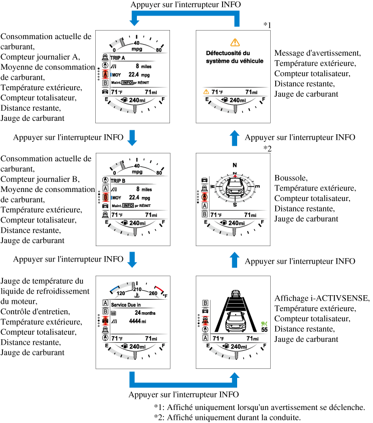 Le contenu de l'écran change à chaque appui sur l'interrupteur INFO.