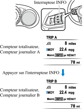 Par exemple, le compteur journalier A peut enregistrer la distance d'un point d'origine, et le compteur journalier B la distance à partir de quand le plein de carburant est fait.