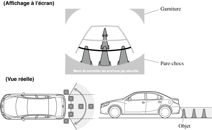 Le champ de vision est limité. Les objets sous le pare-chocs ou près des extrémités du pare-chocs peuvent ne pas être affichés.