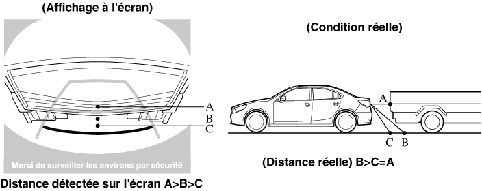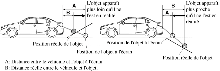Lorsqu'il y a une pente raide montante (ou descendante) derrière le véhicule, l'objet affiché à l'écran apparaît plus loin (ou plus près en cas de pente descendante) qu'il ne l'est en réalité.