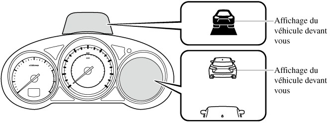 L'état de fonctionnement du système d'assistance de reconnaissance de distance (DRSS) est indiqué sur l'affichage multi-informations ou de conduite active. En ce qui concerne les dysfonctionnements, vérifiez les conditions du véhicule ou faites-le inspecter par un concessionnaire agréé Mazda conformément au contenu du message affiché.