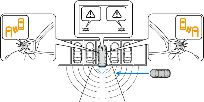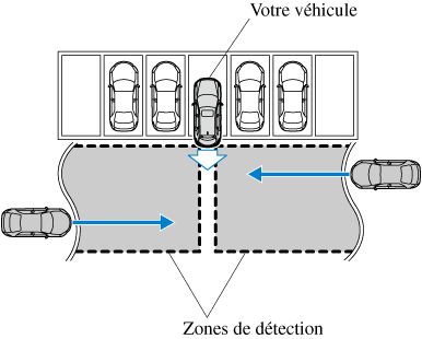 Le système d'alerte de circulation transversale à l'arrière (RCTA) détecte les véhicules qui s'approchent par les côtés gauche et droit du véhicule lorsque le véhicule fait marche arrière à partir d'un espace de stationnement, et avertit le conducteur de danger possible en utilisant les voyants de surveillance des angles morts (BSM) et l'avertisseur sonore.