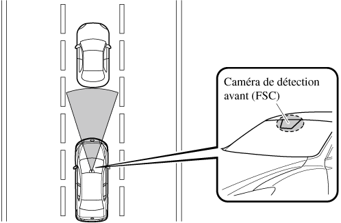 Dans les cas suivants, la caméra de détection avant (FSC) détermine qu'un véhicule est présent à l'avant et le système d'assistance de frein intelligent Ville (SCBS) peut fonctionner.
