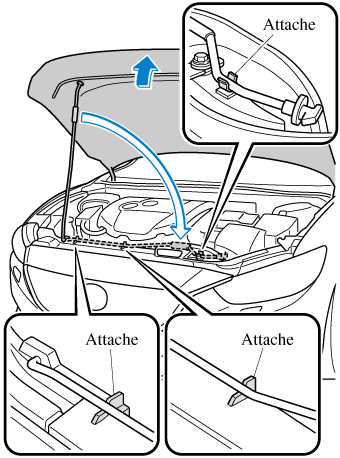 2. Soulever le capot, saisir l'endroit du caoutchouc sur la tige de support et le fixer la tige de support dans l'attache. Vérifier que la tige de support est fixée dans l'attache avant de fermer le capot.
