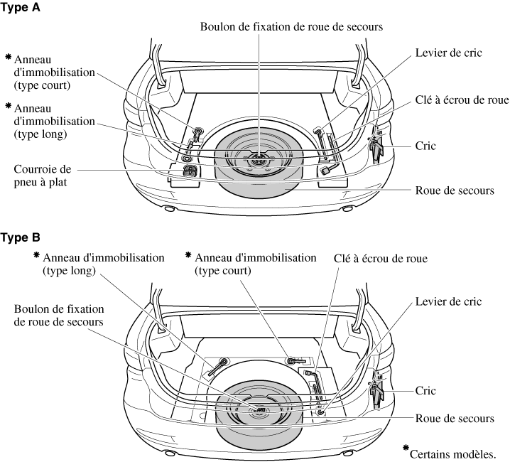La roue de secours et les outils sont rangés aux endroits indiqués sur l'illustration.