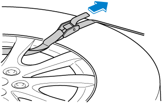 Faire passer la courroie dans la boucle, puis tirer l'extrémité de la courroie pour bloquer le pneu crevé.