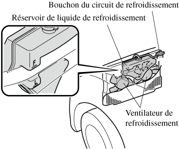 Si le ventilateur de refroidissement ne fonctionne pas lorsque le moteur tourne, la température du moteur augmentera. Arrêter le moteur et faire appel à un concessionnaire agréé Mazda.