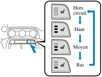 Si le contacteur est mis sur la position d'arrêt pendant que le chauffage de siège fonctionne (Haut, Moyen ou Bas), puis qu'il est mis à nouveau sur ON, le chauffage de siège fonctionnera automatiquement à la température qui était réglée avant que le contacteur ait été mis sur la position d'arrêt.