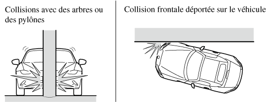 Les illustrations suivantes sont des exemples de collisions frontale/semi-frontale qui sont susceptibles de ne pas être détectées comme assez sévères pour justifier le déploiement de l'équipement de coussin d'air SRS.