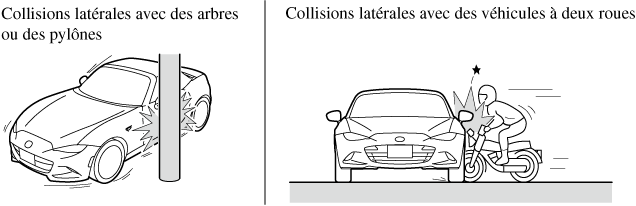 Les illustrations suivantes sont des exemples de collisions latérales qui sont susceptibles de ne pas être détectées comme assez sévères pour justifier le déploiement de l'équipement de coussin d'air SRS.