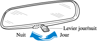 Pousser le levier jour/nuit vers l'avant pour une conduite de jour. Le tirer vers l'arrière pour réduire l'éblouissement causé par les phares des voitures roulant derrière.
