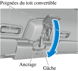 Le toit convertible risquera d'être comprimé si on le laisse rétracté pendant une longue période. Par conséquent, si la capote a été comprimée, il pourra être difficile d'accrocher la gâche pour la gâche supérieure à l'ancrage.