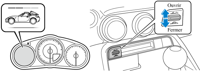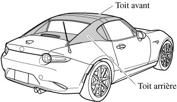 Le fastback rétractable s'ouvre/se ferme électriquement grâce aux interrupteurs à l'intérieur du véhicule. Lors de l'ouverture/fermeture, le toit et la vitre fonctionnent conjointement. Le toit avant est rangé dans l'espace de rangement se trouvant sous le toit arrière.